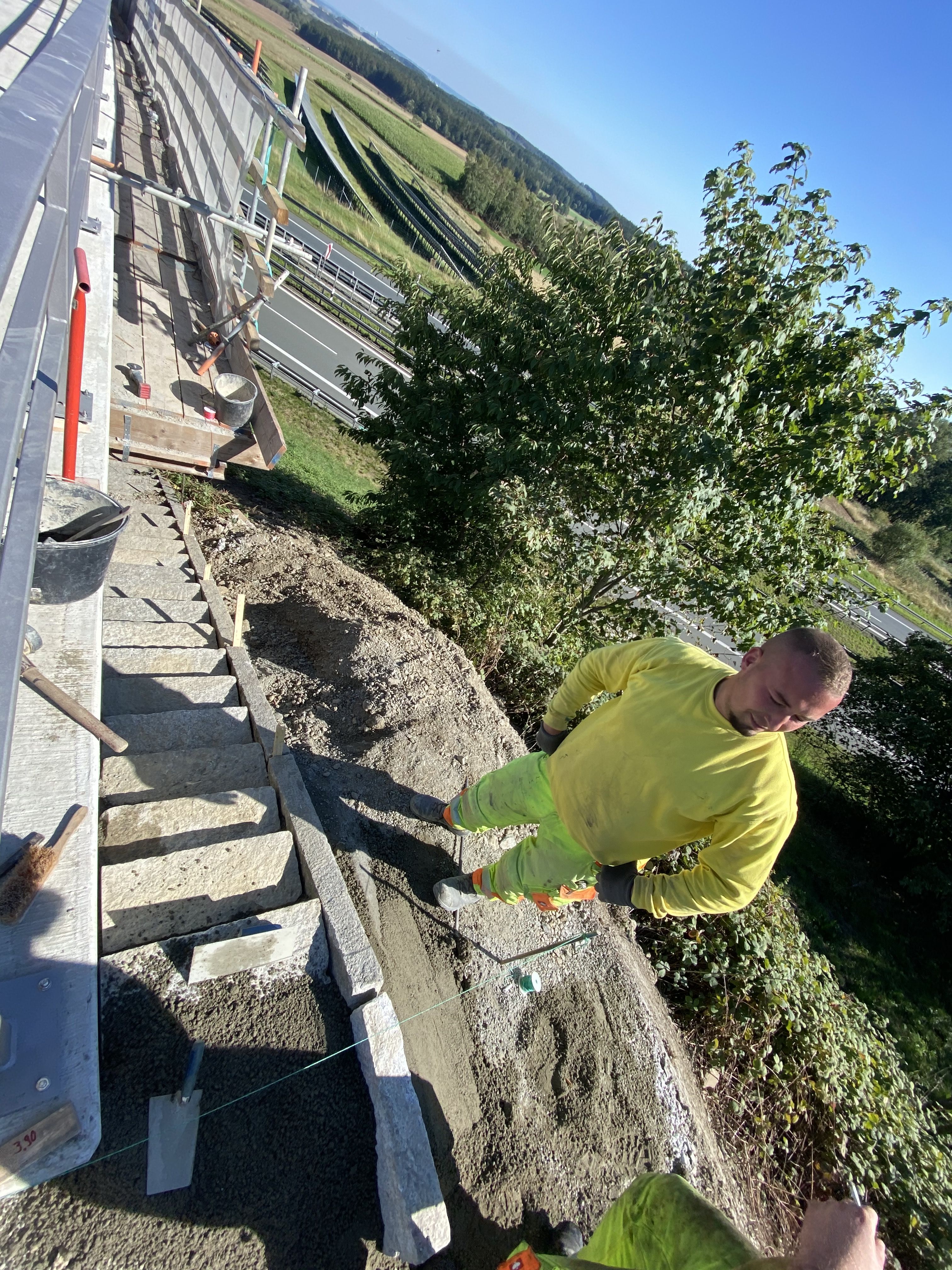 Auf der Brücke sanieren wir die Einläufe der Brückenentwässerung im Inlinerverfahren. Neben der Brücke baut unser Tiefbau die Treppe, die Wege und die Entwässerung neu, die während der Brückensanierung abgebaut werden mussten.