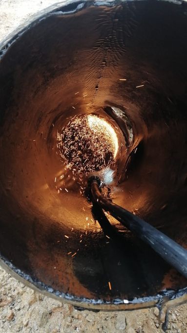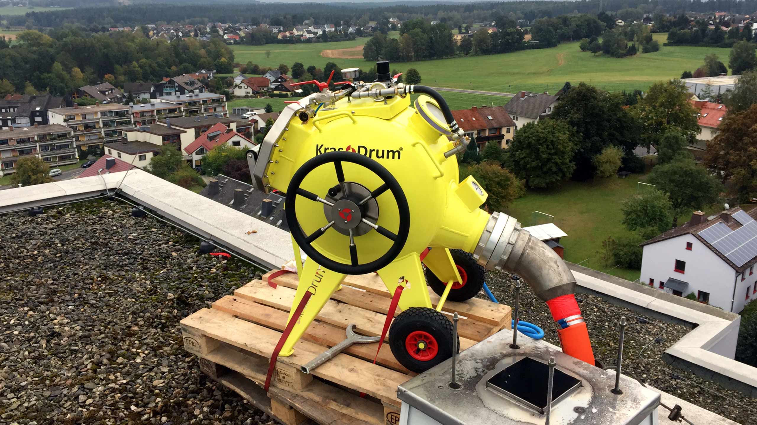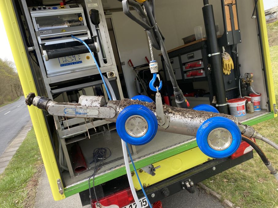 Angetrieben von einem Baukompressor mit 15 Bar und 1m³, kann auch dieser Beton und Baustahl aus einer Leitung entfernen. Kontinuierliche Aufzeichung ist möglich.